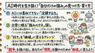 AI時代に「自分だけの強み」を見つけ、キャリアの武器にする方法をお伝えします。子供の頃に夢中になったことや、今も苦なく続けられることの中に眠る「原石」を社会のニーズに合わせて翻訳することで、無理なく成果を出し、幸せに働くヒントを解説します。