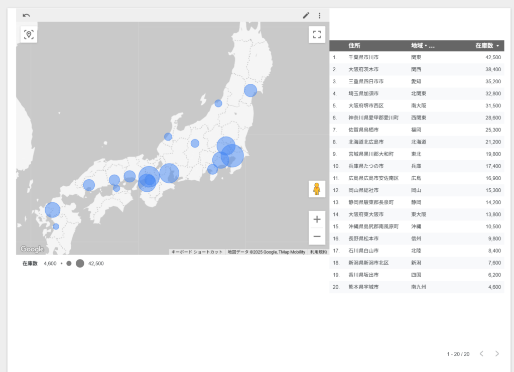 物流管理において、数字の羅列(スプレッドシート)だけでは「どこに在庫が偏っているか」を直感的に判断するのは困難です。本プロジェクトでは、Google Looker Studioを活用し、「一目で在庫の重みがわかる」インテリジェントなマップレポートを構築しました。