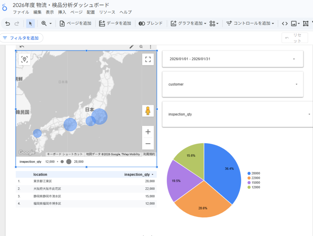 - 日本地図との連動: 住所情報を地理データとして定義し直し、拠点ごとの検品数量を地図上のバブル(円)の大きさで表現しました。